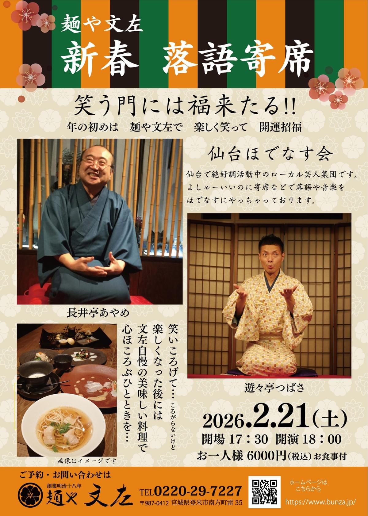 27 de enero de 2026日頃から、麺や文左を御愛好頂きまして、誠にありがとうございます。 「麺や文左」でございます。 今年もやりますよぉ!「新春 落語寄席」!! 2/21(土)に開催いたします!!(待ってました!パチパチパチ👏) 去年も爆笑の渦を巻き起こし、文左の爆笑伝説を刻み続けている「仙台ほでなす会」の長井亭あやめさん、遊々亭つばささんによる落語です。 落語!最高!!ヾ(≧▽≦)ノ 去年も面白くて面白くて、本当は転げまわって笑いたいくらいでした。 スタッフとしては皆様より転げ回るわけにもいかず、笑いを耐えに耐え、腹筋崩落の危機に毎年陥っております。……でもやせないけどね。 ...27 de enero de 2026麺や文左です。麺や文左2026年2月の特別限定ランチのお知らせです。 年明けからもう1か月が過ぎようとしております。早いですね。 寒さもかなり厳しくなってきております。 そんな激寒の2月におススメしたい麺や文左の限定ランチのご案内です。 遅くなって申し訳ございません。 26年2月限定ランチ【【如月陽-きさらぎ-】 期間:2月7日(土)~2月15日(日) 料金:お一人様2,700円税込2,970円 2月もとってもおすすめですよ~ぉ。 ≪おしながき≫ 八寸 浅利のスープ 海の幸 エスカルゴ風 鰯のマリネ 冷菜 鮃 菜種造り 焼物 鶏肉のポアレ ...30 de diciembre de 2025麺や文左です。 今年一年、皆様には本当にお世話になりました。 麺や文左は2025年12月31日~2026年1月6日までお休みをいただきます。 今年も一年がんばってこれたのも皆様のおかげです。 たくさんの笑顔とたくさんのうれしいお言葉で楽しい一年を過ごさせていただきました。 2026年も精一杯頑張りたいと思っております。 新しい年も変わらぬご愛顧を賜りますよう、何卒よろしくお願いいたします。 新年の営業カレンダーはコチラになります。 電話につきましては、現在留守番電話になっております。 ご返信は営業開始の7日からとなりますので、何卒よろしくお願いいた...他の投稿文左でお祝い
