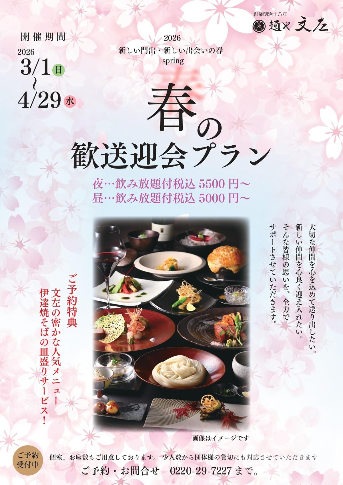 3 mars 2026麺や文左です。 春は旅立ちと出会いの季節。 大切な仲間との思い出づくりとこれからの激励。 新しい仲間の歓迎とこれからの友好的な関係づくりに。 この時期、歓送迎会は必須企画。 麺や文左ではそんな皆様に絆を深める楽しい場の提供をさせていただきたいと思っております。 歓送迎会では「美味しいお料理」は必須!! 麺や文左のお料理は料理長が腕によりをかけて素材を活かしたお料理を提供しています。 どのお料理もお酒に合う!!と大変好評いただいております。 もちろん、お酒が飲めない方にも「こんなお料理食べたことない!すごく美味しい!!」というお声も頂いております。 ...27 février 2026麺や文左です。 麺や文左2026年3月の特別限定ランチのお知らせです。 春っぽい日差しの日がちょこちょこ出てきましたね~。 探したらフキノトウとかひょっこり顔を出してたりしませんかね? ……ちょっと探しに行ってみようと思います!! 2026年3月限定ランチ【彌生月-やよいづき-】 期間:3月14日(土)~3月22日(日) 料金:お一人様2,700円税込2,970円 春にぴったりなランチメニューです。 ≪おしながき≫ 八寸 独活と椎茸の蕗味噌和え 鮃の桜寿し 蕪のブラマンジェ 冷菜 金目鯛とあおり烏賊 春野菜を添...27 janvier 2026日頃から、麺や文左を御愛好頂きまして、誠にありがとうございます。 「麺や文左」でございます。 今年もやりますよぉ!「新春 落語寄席」!! 2/21(土)に開催いたします!!(待ってました!パチパチパチ👏) 去年も爆笑の渦を巻き起こし、文左の爆笑伝説を刻み続けている「仙台ほでなす会」の長井亭あやめさん、遊々亭つばささんによる落語です。 落語!最高!!ヾ(≧▽≦)ノ 去年も面白くて面白くて、本当は転げまわって笑いたいくらいでした。 スタッフとしては皆様より転げ回るわけにもいかず、笑いを耐えに耐え、腹筋崩落の危機に毎年陥っております。……でもやせないけどね。 ...他の投稿文左でお祝い